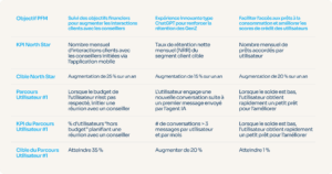 Par exemple, si votre but est de suivre les objectifs financiers tout en renforçant les échanges entre les clients et leurs conseillers, votre North Star pourrait être le nombre d’interactions mensuelles initiées via l’application.