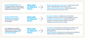 Pour contrer ces risques, il est nécessaire de commencer par effectuer une analyse approfondie du marché et de la concurrence, une segmentation et une étude des utilisateurs, ainsi qu’une analyse des problèmes. Cela permet de s’assurer que les difficultés que vous résolvez et la solution que vous proposez apportent suffisamment de valeur ajoutée à vos clients pour qu’ils les utilisent réellement. Ensuite, il est important de se concentrer non seulement sur l’adoption par les utilisateurs, mais également sur l’amélioration de l’expérience utilisateur en créant des prototypes et en effectuant des tests d’utilisabilité.