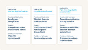 Un objectif bien défini donne une vraie raison d’être à votre app PFM. Il permet de fixer des attentes claires, tant pour les utilisateurs que pour les parties prenantes internes (équipes techniques, direction, etc.). Et surtout, il doit être en phase avec la stratégie globale de la banque. Cela garantit un soutien interne plus fort, plus stable — un levier clé dans un projet numérique qui demandera des itérations et arbitrages.